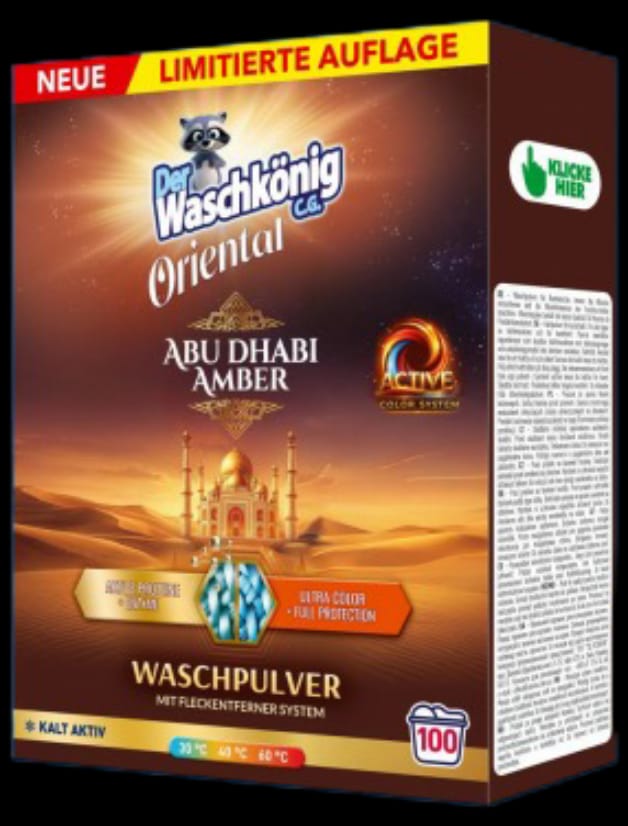 Prací prášok Der Waschkönig C.G. Oriental zabezpečuje silný prací účinok už pri nízkych teplotách. Preniká hlboko do vlákien, odstraňuje aj odolné škvrny a zároveň chráni textílie pred opotrebovaním.